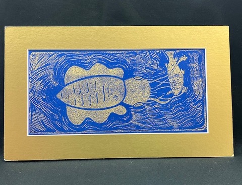 Bithai (squid) Ocean Blue silk, Gold frame, Gold relief